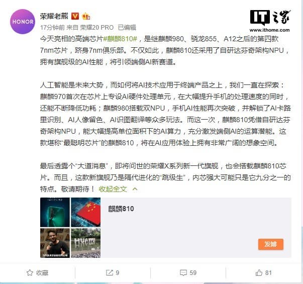 Сегодня Huawei официально представила Kirin 810 — свою вторую однокристальную систему, выполненную по техпроцессу 7 нм. И практически сразу после этого вице-президент Honor Сюн Цзюньминь (Xiong Junmin), отвечающий за новые продукты, сообщил, что новая платформа будет использоваться в новом же смартфоне Honor.