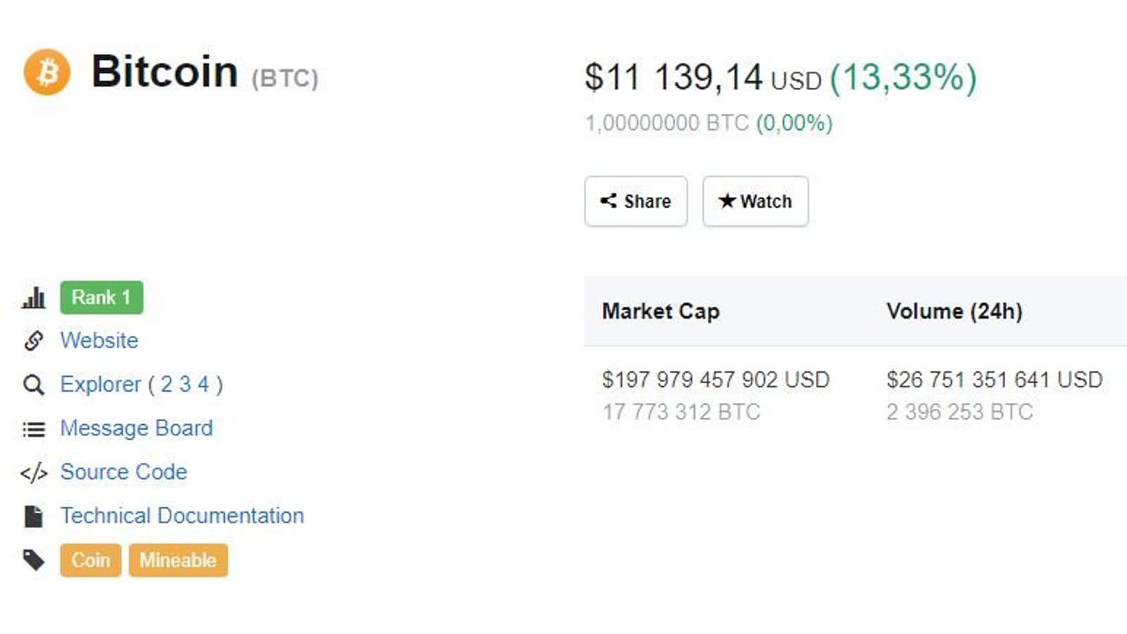 Bitcoin продолжает расти, причем в последнее время рост сильно ускорился: только за последние сутки криптовалюта подорожала на 13,33% и достигла отметки $11139 (на момент написания новости).