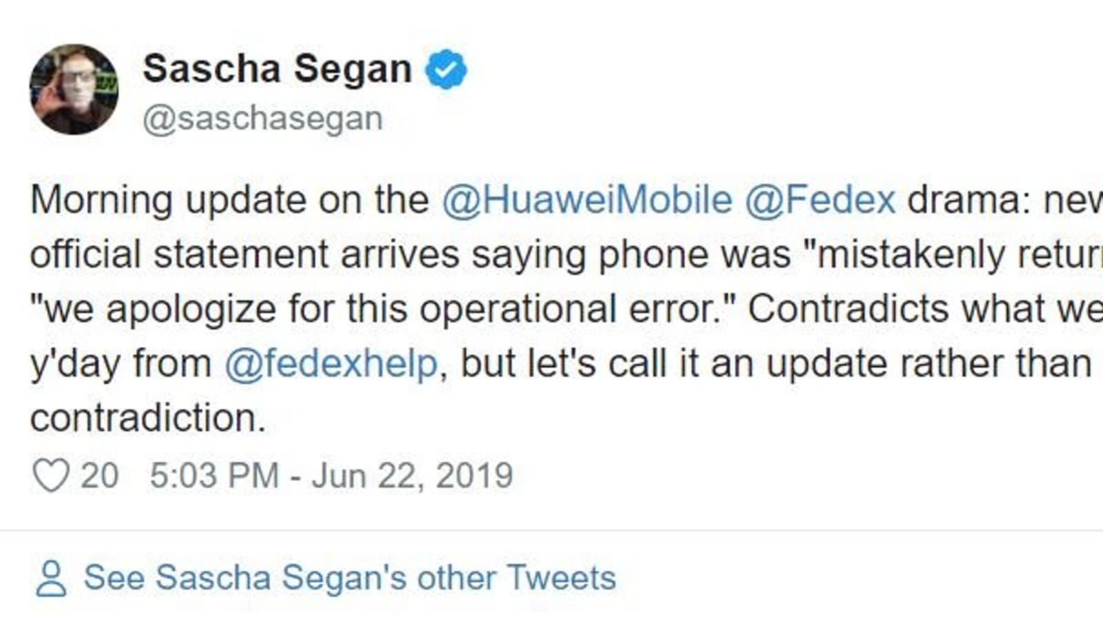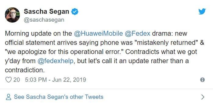 Вчерашняя история со смартфоном Huawei P30 Pro, отправленным из Великобритании в США, но так и не дошедшим до адресата по вине службы FedEx, имела продолжение. Логистическая компания назвала случившееся «ошибочным возвратом» и принесла свои извинения за «ошибку, допущенную в ходе рабочего процесса».