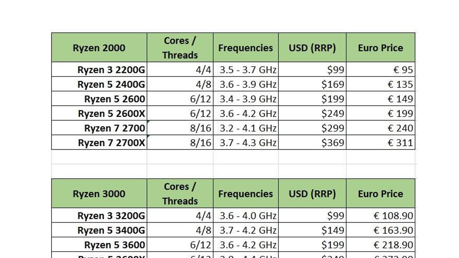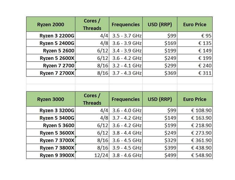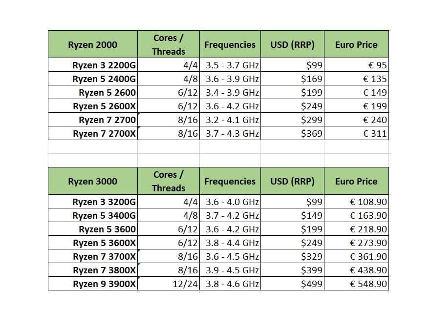 Португальский онлайновый магазин обновил свой прайс-лист, в котором прописались AMD Ryzen 3000. В двух таблицах ниже указаны цены текущей линейки – Ryzen 2000, и новой – Ryzen 3000. В обоих случаях – с привязкой к рекомендованной розничной цене в США.