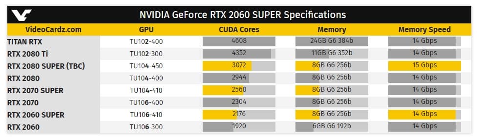 RTX 2070 Super будет на 16% быстрее обычной версии RTX 2070 и на сколько-то быстрее GTX 1080 Ti. Данный адаптер получит 320 тензорных ядер, 40 ядер RT, 184 текстурных блока и 64 блока ROP. Частоты GPU составят 1605-1770 МГц, а TDP — 215 Вт.