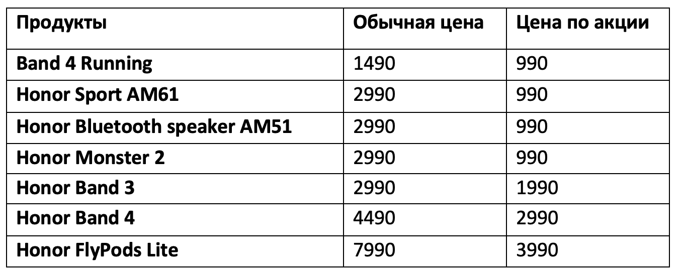 В честь открытия интернет-магазина бренд запустил специальную акцию для первых покупателей honor.ru: в течение всего июля каждый вторник с 11:00 пользователи смогут приобрести девайсы по выгодным ценам. Например, Honor Band 4 будет доступен за 2 990 руб. вместо 4 490 руб., а наушники FlyPods Lite можно будет приобрести по цене 3 990 руб. вместо 7 990 руб. Подробная информация об акции доступна на сайте honor.ru и в таблице ниже, количество товаров ограничено.