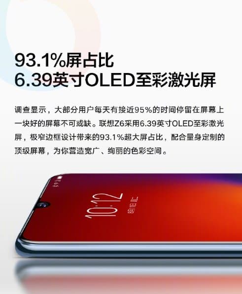 Lenovo Z6 получит дисплей AMOLED диагональю 6,39 дюйма — один из самых распространённых вариантов на рынке на сегодняшний день. Сканер отпечатков, срабатывающий за 0,13 с, расположится под экраном, а сам дисплей якобы будет занимать 93,1% площади передней поверхности.