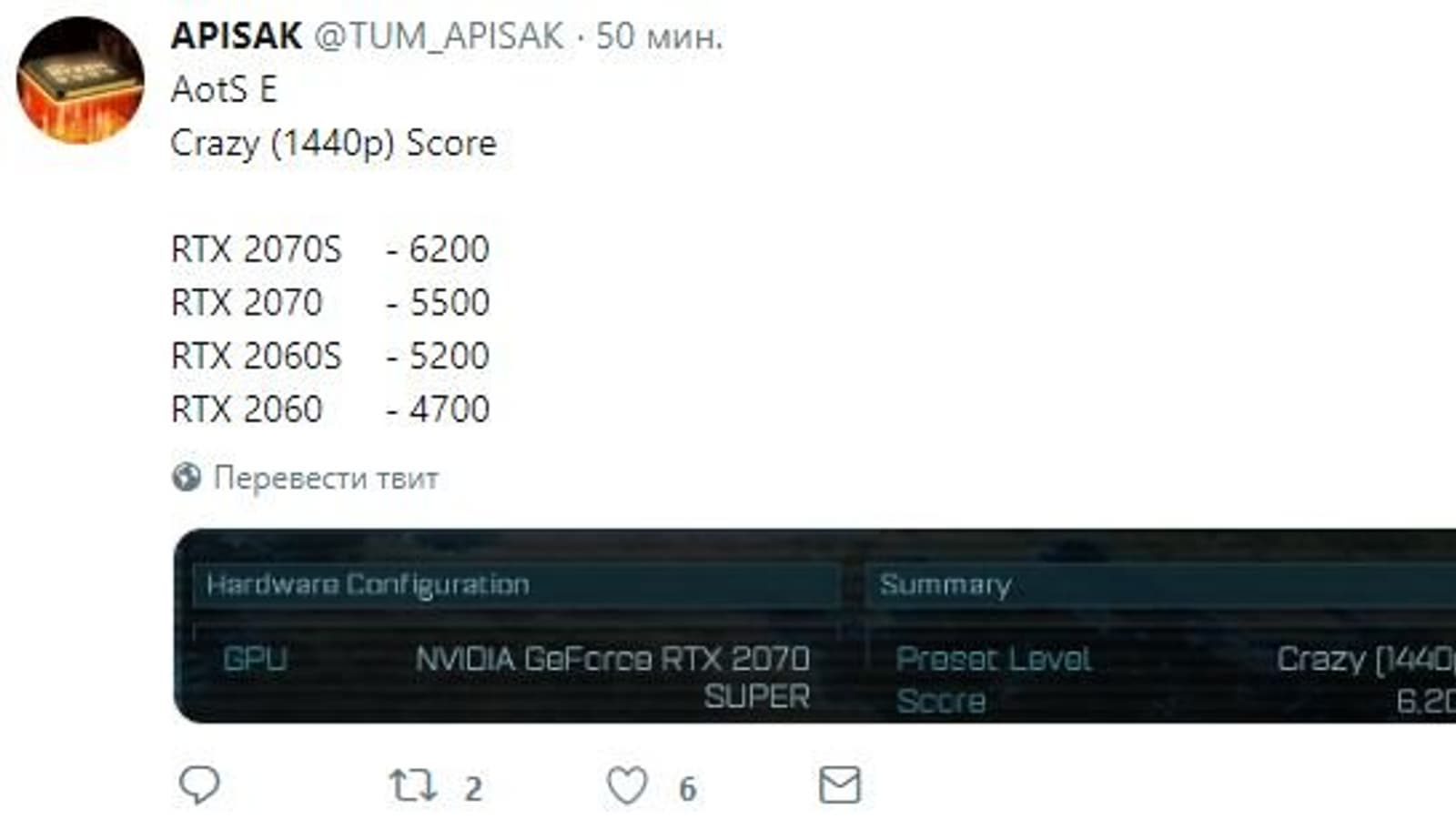 Видеокарты тестировались при разрешении 1440p. GeForce RTX 2070 Super набрала 6200 баллов, а GeForce RTX 2060 Super — 5200 баллов. Для сравнения, в тех же условиях GeForce RTX 2070 набирает 5500 баллов, а GeForce RTX 2060 — 4700 баллов.