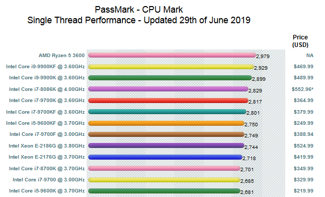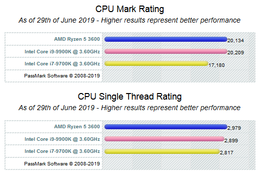 Данная модель появилась в базе бенчмарка CPUBenchmark, где, что удивительно, в однопоточном режиме обошла всех конкурентов. В многопоточном режиме Ryzen 5 3600 так же силён.