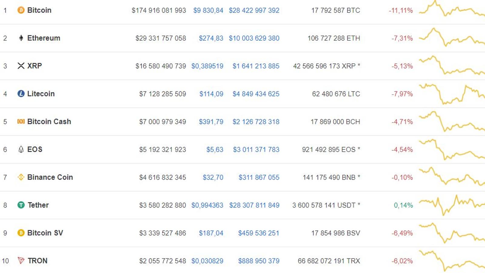 Теперь Bitcoin стоит менее $10 000 — $9 830 на момент написания новости. Вместе с ним дешевеют и другие криптовалюты, хотя и в меньшей степени. В Топ-10 CoinMarketCap только Tether демонстрирует положительную динамику, да и то всего на 0,14%.