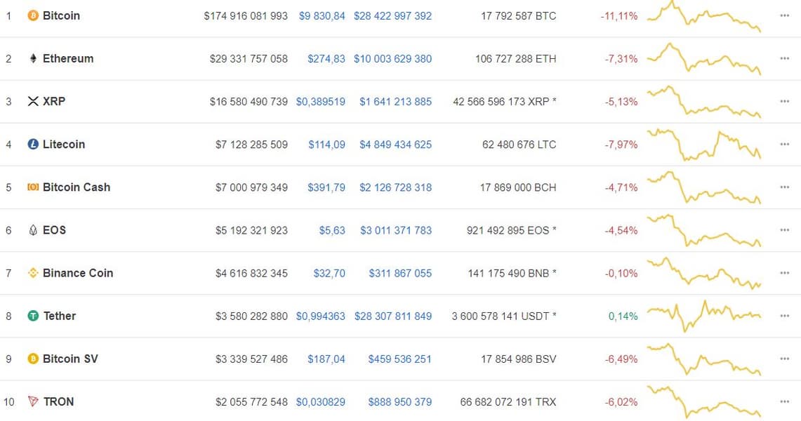 Теперь Bitcoin стоит менее $10 000 — $9 830 на момент написания новости. Вместе с ним дешевеют и другие криптовалюты, хотя и в меньшей степени. В Топ-10 CoinMarketCap только Tether демонстрирует положительную динамику, да и то всего на 0,14%.