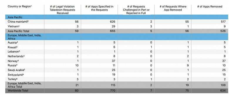 Как можно видеть, за полгода Apple получила 80 запросов из 11 стран на удаление 770 приложений. Больше всего запросов пришло из Китая (56), также 10 пришло из России. Из 770 запрошенных было удалено 634 приложения. Конечно, в документе нет ни списка этих приложений, ни причин по каждому из них, но есть указание, что подавляющее большинство запросов связно с азартными играми, порнографией, нарушением закона о конфиденциальности данных и нарушению авторских прав.