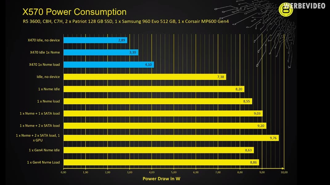 В итоге у автора видео получилось, что в покое без каких бы то ни было подключённых накопителей чипсет потребляет около 7,38 Вт. И это два с половиной раза больше, чем потребляет в таких же условиях X470. Ну а остальные результаты можете видеть на диаграмме ниже.
