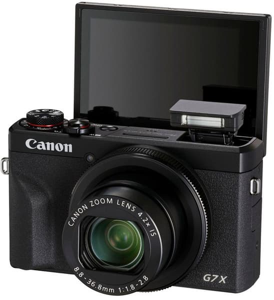 Камера PowerShot G7 X Mark III оснащена объективом с ЭФР 24-100 мм и максимальной диафрагмой f/1,8–2,8. Видоискателя у нее нет, есть только отклоняемый вверх трехдюймовый сенсорный экран, угол наклона которого можно менять. При габаритах 105,5 x 60,9 x 41,4 мм камера весит 304 г. На одной зарядке она может сделать 235 снимков.