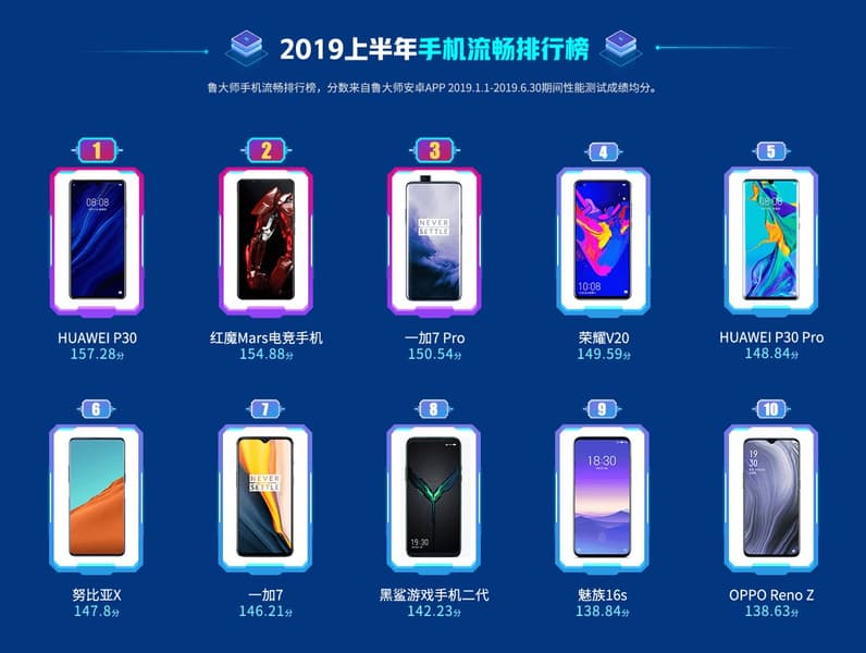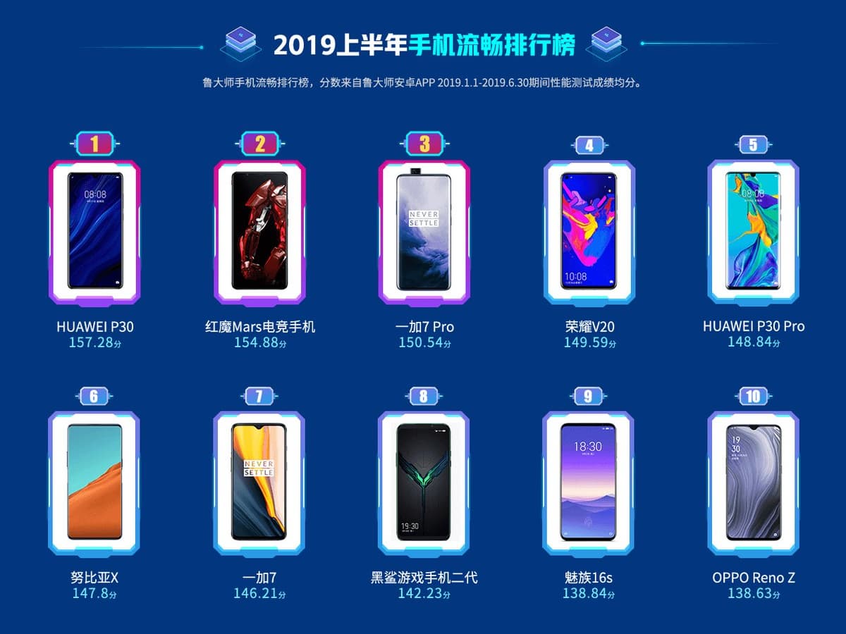 Первый рейтинг перечисляет самые популярные смартфоны первой половины 2019, возглавляет его Huawei P30. OnePlus 7 Pro занимает третье место, а Huawei P30 Pro досталось пятое место.