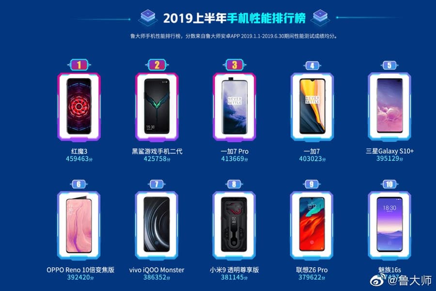 На второй картинке указаны самые производительные мобильные устройства, лидером здесь является Nubia Red Magic 3, хотя OnePlus 7 Pro снова удалось подняться на третье место. Samsung Galaxy S10+ попал на пятое место, также в десятке оказались Oppo Reno 10X Zoom, Vivo Iqoo Monster и Meizu 16s.
