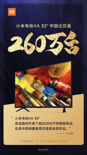 Во-первых, Xiaomi Mi TV 4A стал самым быстро распродаваемым телевизором в своей ценовой категории, который раньше всех остальных преодолел отметку 2 млн проданных единиц (общие продажи в Китае уже превысили 2,6 млн единиц). Во-вторых, в Китае модель остается самым продаваемым ЖК-телевизором.