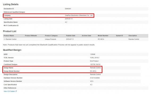 Пульт ДУ производства OnePlus с модельным номером RC-001A поддерживает интерфейс Bluetooth 4.2. А дополнительных подробностей документация на сайте Bluetooth SIG не предоставляет.