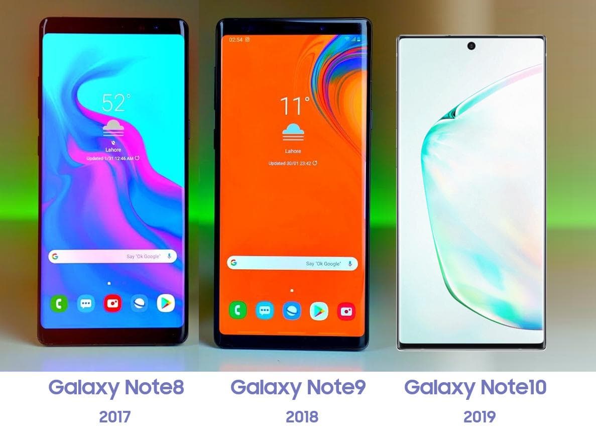 На этом изображении рядом показаны сразу три поколения смартфонов линейки Samsung Galaxy Note. Стоит отметить, что Samsung Galaxy Note8 и Galaxy Note9 выглядят как смартфоны из одного поколения, разница между ними очень небольшая.