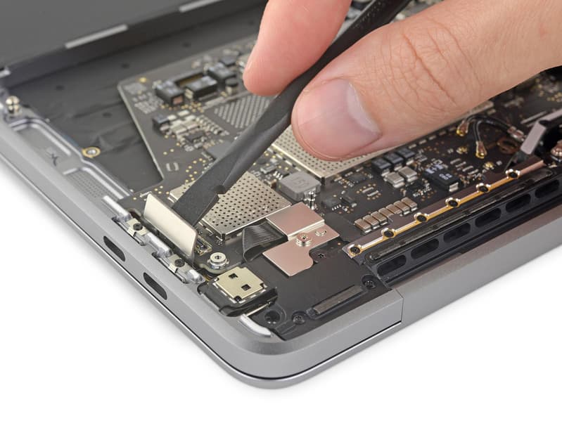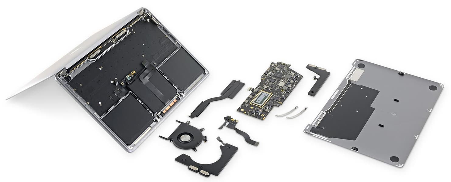 Итак, на стол к препараторам попал компьютер с дисплеем типа IPS размером 13,3 дюйма и разрешением 2560 × 1600 пикселей, построенный на четырехъядерном процессоре Intel Core i5, работающем на частоте 1,4-3,9 ГГц. Конфигурация системы включает 8 ГБ памяти LPDDR3-2133. Микросхемы памяти распаяны прямо на основной плате, как и микросхемы твердотельного накопителя с интерфейсом PCIe. В оснащении ноутбука можно выделить два порта Thunderbolt 3, которые выведены на разъемы USB-C.