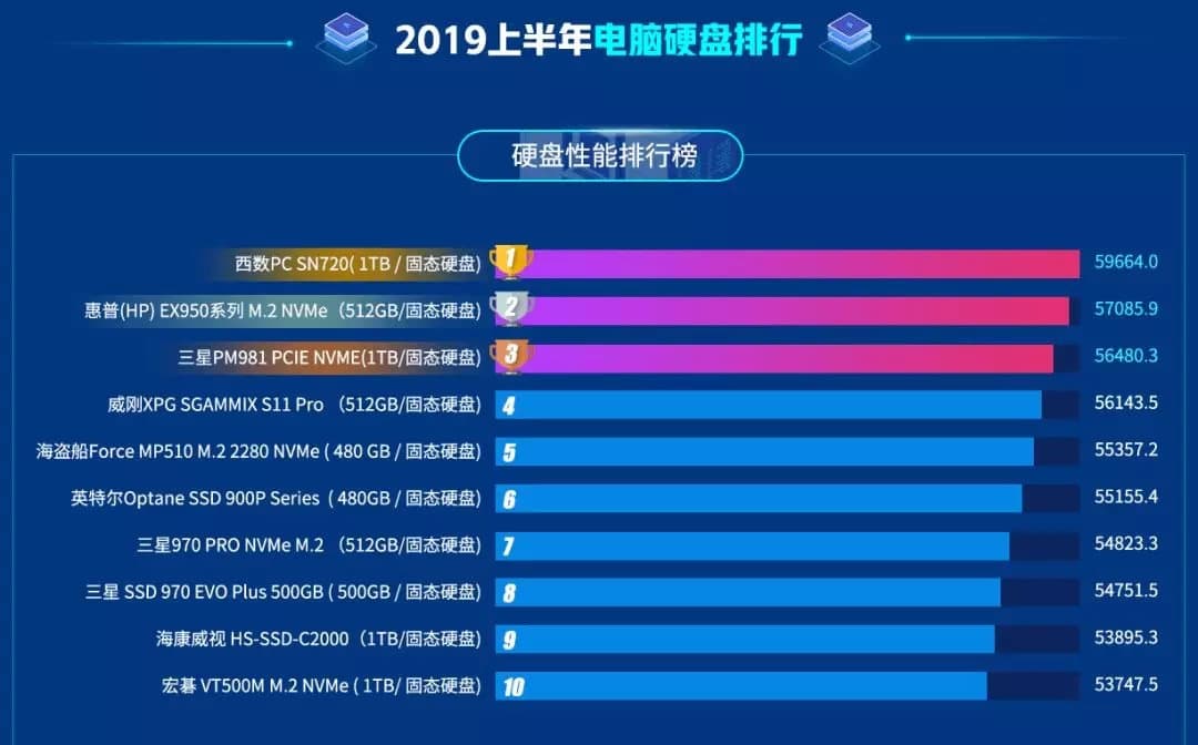В абсолютном рейтинге производительности первое место занял Western Digital PC SN720 объемом 1 ТБ. Этот накопитель типоразмера M.2 характеризуется скоростями 3400 и 2800 МБ/с при последовательном чтении и последовательной записи соответственно — так гласят официальные данные. На втором месте расположился SSD HP EX950 объемом 512 ГБ, на третьем — Samsung PM981 объемом 1 ТБ. Все эти модели поддерживают интерфейс NVMe.