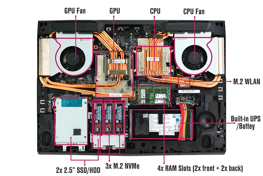 Что касается параметров, сердцем ноутбука могут служить процессоры Core i7-9700K, Core i9-9900K, Xeon E-2176G либо Xeon E-2185G. Что касается видеокарты, на выбор есть GeForce GTX 1060, Quadro P3200, P4200 либо P5200. Оперативной памяти может быть от 32 до 128 ГБ. А вот подсистема хранения данных действительно впечатляет. Ноутбук можно оснастить пятью накопителями! Три из них — это SSD объёмом от 250 ГБ до 2 ТБ, два оставшихся — HDD объёмом от 1 до 8 ТБ. В итоге можно собрать ноутбук с хранилищем суммарным объёмом 22 ТБ!