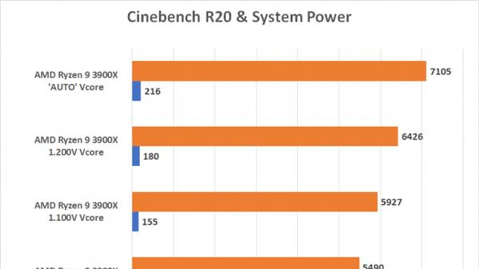 Как видно на этой картинке, при понижении напряжения ядра 12-ядерный Ryzen 9 3900X реагирует закономерно, снижая свою производительность. Но вот что интересно: при понижении напряжения до значения 1 В производительность (по результатам теста Cinebench R20) упала на 16%, а энергопотребление — на все 40%! При этом в таком режиме CPU работал на частоте 4,2 ГГц. По графику хорошо видно, что даже установка Vcore 1,2 В позволяет сократить энергопотребление на 36 Вт, не особо жертвуя производительностью.
