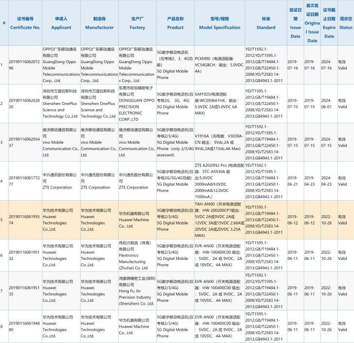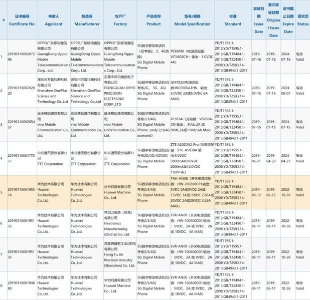 Местный регулятор 3C уже одобрил смартфоны ZTE Axon 10 Pro 5G, OPPO Reno 5G, Vivo iQOO 5G и OnePlus 7 Pro 5G. Четыре другие модели произведены Huawei — это по две версии Huawei Mate 20 X 5G и Mate X 5G, производимые как самой Huawei, так и двумя контрактными производителями — Flextronics Zhuhai и Foxconn Shenzhen. Mate 20 X 5G стал первой моделью, которая получила одобрение государственного телекоммуникационного регулятора, поэтому ожидается, что она поступит в продажу в Китае раньше всего — в начале августа.