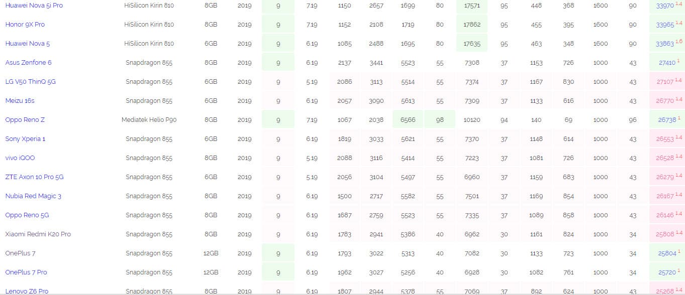 Смартфон Huawei Nova 5i Pro, построенный на базе однокристальной системы Kirin 810, занял первое место со средним результатом 33970 баллов. Второе место в этом рейтинге занимает еще неанонсированный Honor 9X Pro, который построен на базе той же мобильной платформы. Результат смартфона составляет 33965 баллов. Третье место досталось Huawei Nova 5 на той же SoC Kirin 810 с результатом 33863 балла.