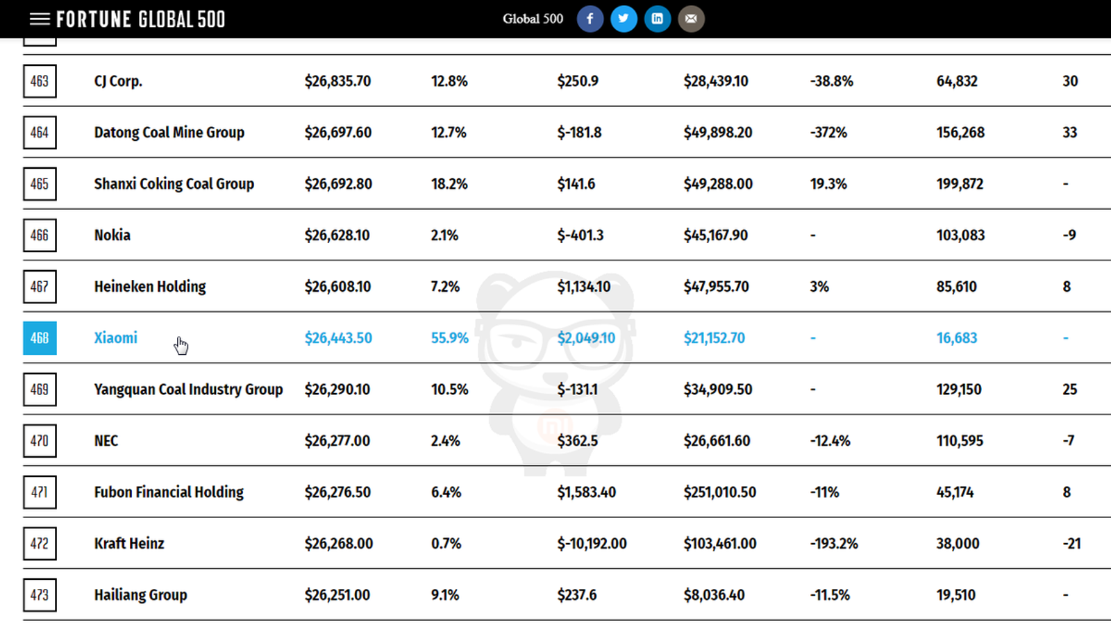 Компания Xiaomi в этом году впервые попала в рейтинг 500 крупнейших мировых компаний, который составляет издание Fortune, используя в качестве критерия сведения о выручке компании.