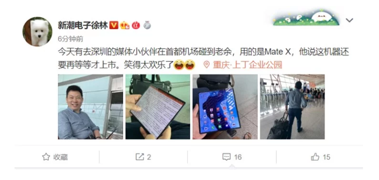 И пока Mate X недоступен для обычных пользователей, он доступен исполнительному директору Huiawe Ричарду Ю (Richard Yu). Он был замечен с гибким смартфоном в аэропорту, причём аппарат он не только не прятал, но и позволил его сфотографировать.