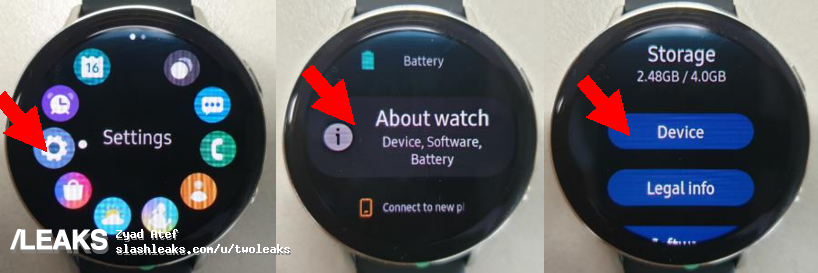 На фотографиях нам демонстрируют различные экраны, в частности, экран настроек, раздел «Об устройстве». Еще одно фото подтверждает, что Samsung Galaxy Watch Active 2 будут оснащены 4 ГБ встроенной флэш-памяти.