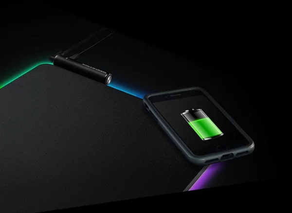 В правом верхнем углу коврика для мыши расположена зона беспроводной зарядки Qi. Есть светодиодный индикатор, который показывает, что беспроводное устройство заряжается.