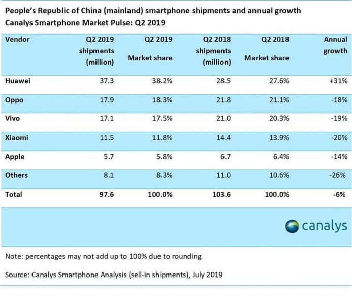 Canalys опубликовала отчет о поставках смартфонов в Китае во втором квартале текущего года. По данным аналитиков, рынок упал: поставки смартфонов за апрель, май и июнь в сумме составили 97,6 миллионов — на 6% меньше, чем в прошлом году.