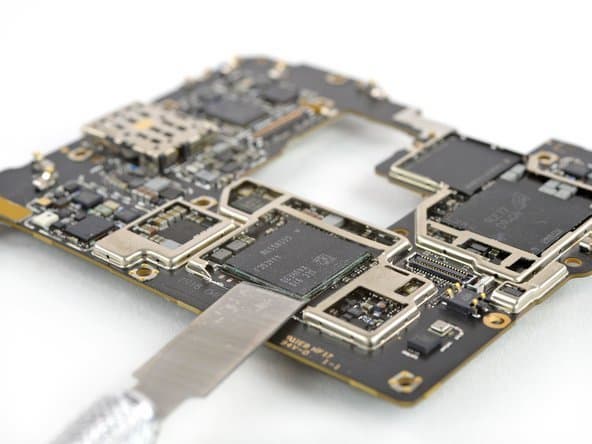 После извлечения системной платы… на ней не удалось обнаружить модем 5G Balong 5000. Как оказалось, он представляет собой бутерброд из, собственно, самого модема, а также модуля оперативной памяти LPDDR4X. Только если физически удалить первый слой, представленный чипом памяти, под ним обнаружится HiSilicon Hi9500 GFCV101. Судя по всему, для модема 5G требуется собственный буфер данных, и совсем не маленького объема.