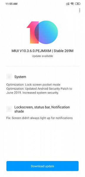 Обновление MIUI 10.3.6.0 с номером PEJMIXM объёмом 269 МБ приносит июньское обновление безопасности Android, улучшение для экрана блокировки в режиме «в кармане» с увеличенной громкостью звука, а также устраняет ошибку из-за которой экран не включался для оповещений.