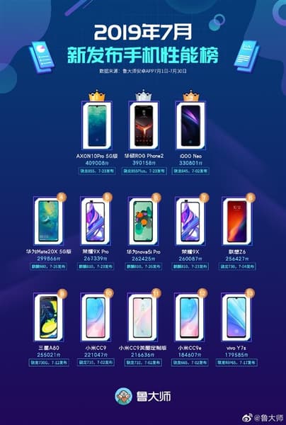 Помимо всех этих моделей в Топ-10 июльского рейтинга Master Lu вошли Huawei Mate 20 X 5G и Huawei nova 5i Pro, Lenovo Z6, Samsung Galaxy A80 и Xiaomi CC9.