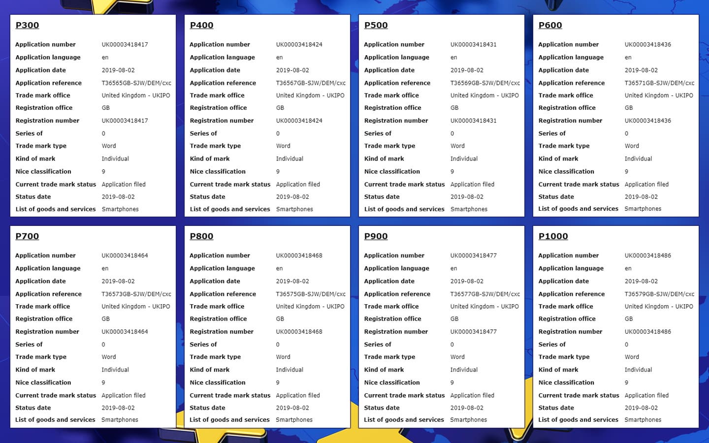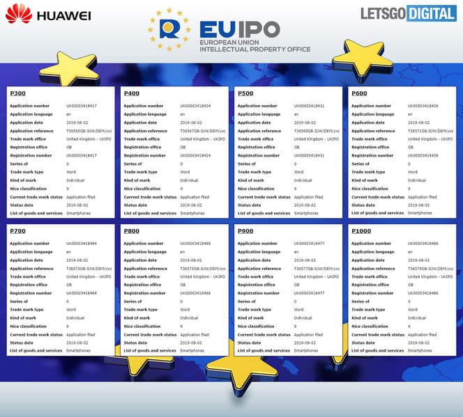 Ранее мы писали о том, что Huawei оформила патенты на обозначения перспективных смартфонов P300, P400 и P500. Но, как оказалось, в этой линейке будет гораздо больше моделей: компания зарегистрировала обозначения P600, P700, P800, P900 и P1000 сразу в двух бюро — Ведомстве по интеллектуальной собственности Европейского союза и Офисе интеллектуальной собственности Великобритании.