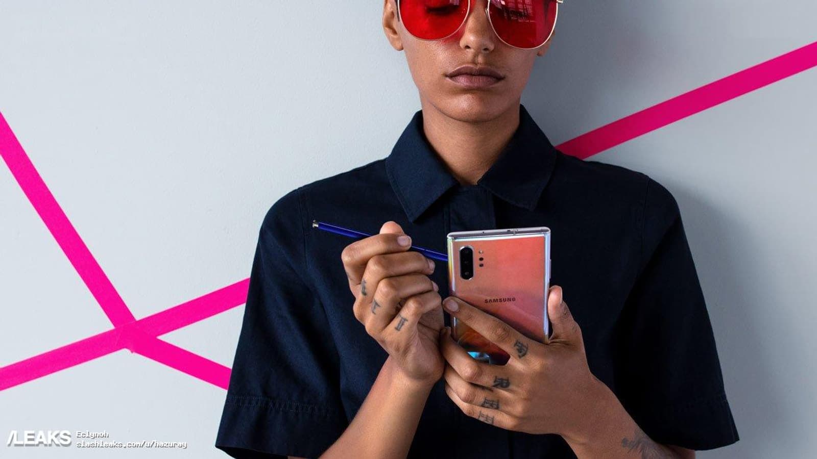 Ресурс SlashLeaks опубликовал новую фотографию смартфона Samsung Galaxy Note10+ в цвете Aura Glow, которая, вполне возможно, является кадром из официального промо-ролика грядущего флагмана.