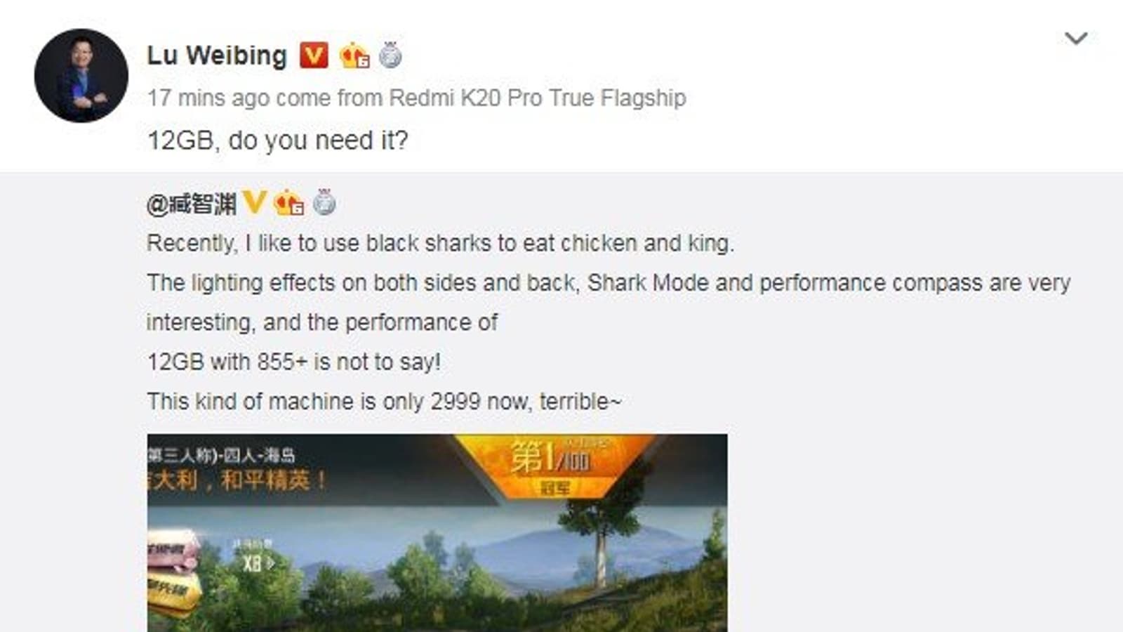 На своей страничке в социальной сети Weibo Лу Вейбинг скопировал хвалебный отзыв пользователя о смартфоне Black Shark 2 Pro, который оснащен новейшей однкористальной системой Qualcomm Snapdragon 855 Plus и 12 ГБ оперативной памяти.