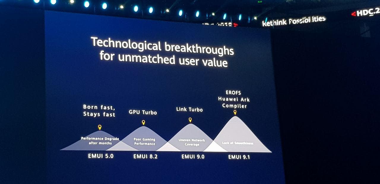 Следующий слайд демонстрирует, какие нововведения приносили с собой различные версии EMUI, включая файловую систему EROFS и компилятор Ark, которые были добавлены с выпуском EMUI 9.1.
