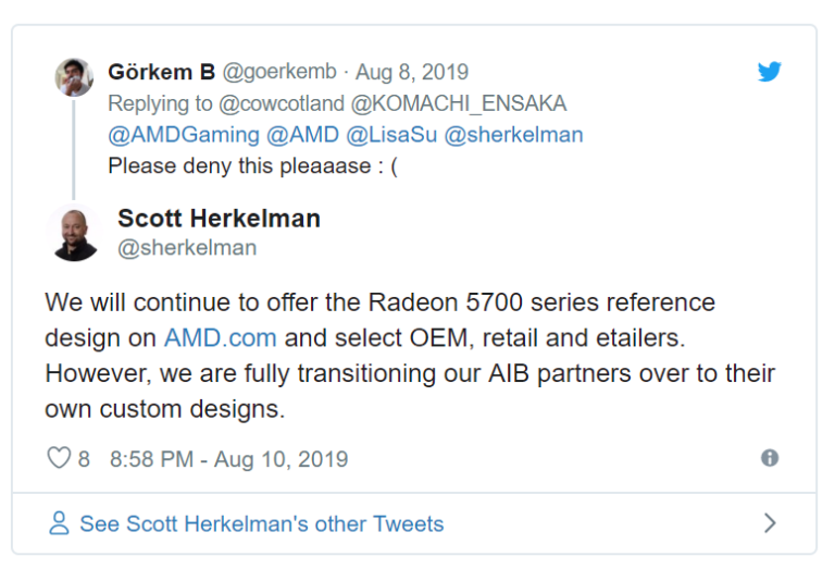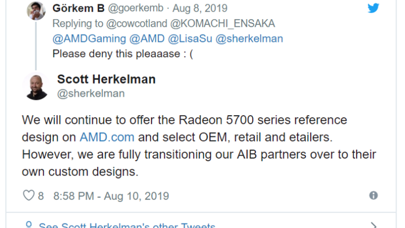 Ответ пришлось держать бренд-менеджеру торговой марки Radeon Скотту Херкельману (Scott Herkelman). Он, в частности, сообщил, что компания продолжит предлагать референсные версии видеокарт Radeon RX 5700 как через официальный сайт, так и через партнеров OEM, а также розничные- и интернет-площадки. При этом AMD полностью поддерживает партнеров, выпускающих модифицированные версии этих 3D-карт.