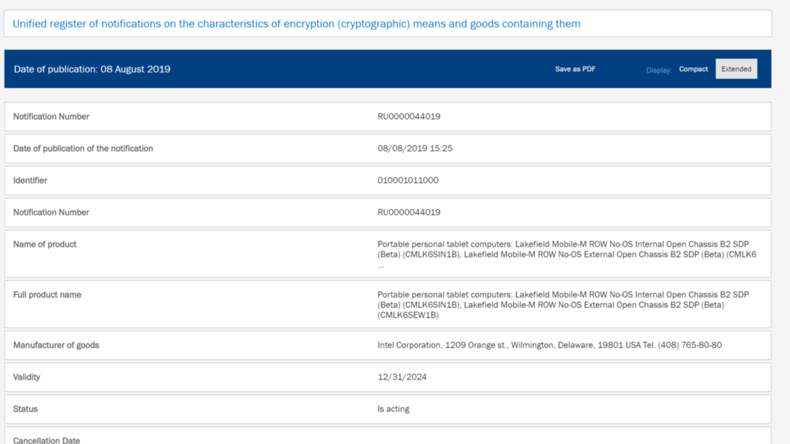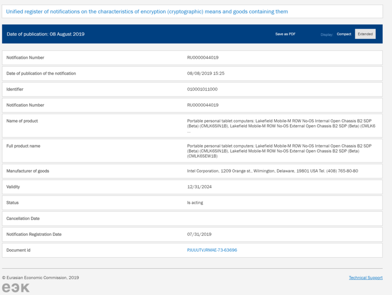 Судя по описанию, речь идет о каком-то тестовом экземпляре «PC Tablet Computer». Учитывая, что рынок планшетов, мягко говоря, сейчас невелик, скорее под этим обозначением скрывается трансформируемый ноутбук. Если дело дошло до регистрации таких устройств в базе ЕЭК, значит премьера новых 10-нанометровых процессоров Intel уже не за горами, а за ней последует и массовый выпуск готовых устройств.