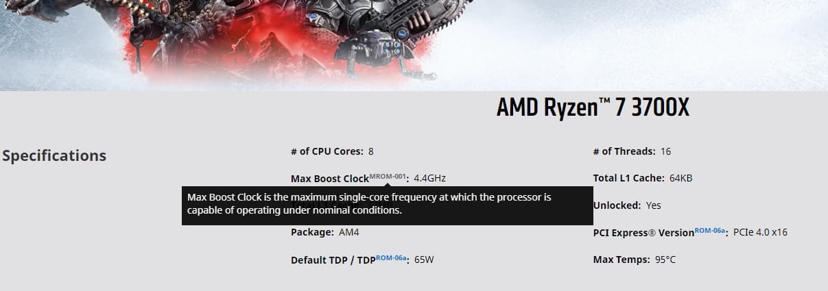 AMD решила уточнить этот аспект, добавив на официальном сайте разъяснение. У показателя Max Boost Clock есть подсказка, где сказано, что это максимальная частота одного ядра, на которой процессор способен работать в номинальных условиях.