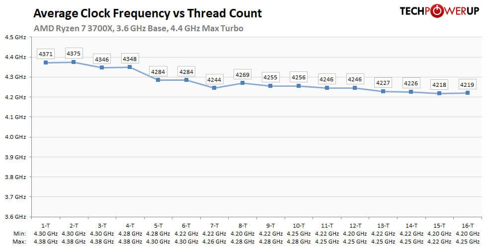 Как видим, в случае Ryzen 7 3700X максимальная частота одного из ядер достигает 4,375 ГГц при 4,4 ГГц, заявленных в спецификациях в качестве Max Boost Clock. Остальные ядра работают на чуть меньших частотах: от 4,219 до 4,371 ГГц. То есть разница невелика, но среднее значение уже не так близко к тем самым 4,4 ГГц.