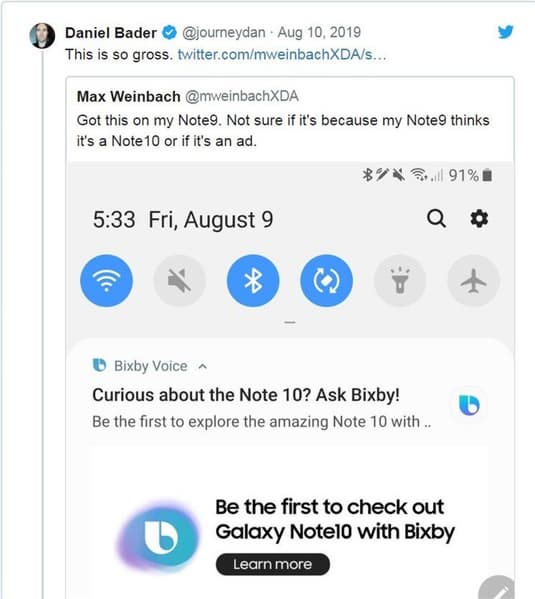 Через Bixby пользователи старых смартфонов Samsung начали получать рекламные сообщения с предложением ознакомиться с Galaxy Note10. Рассылка рекламы носит массовый характер, что хорошо видно по скриншотам ниже.