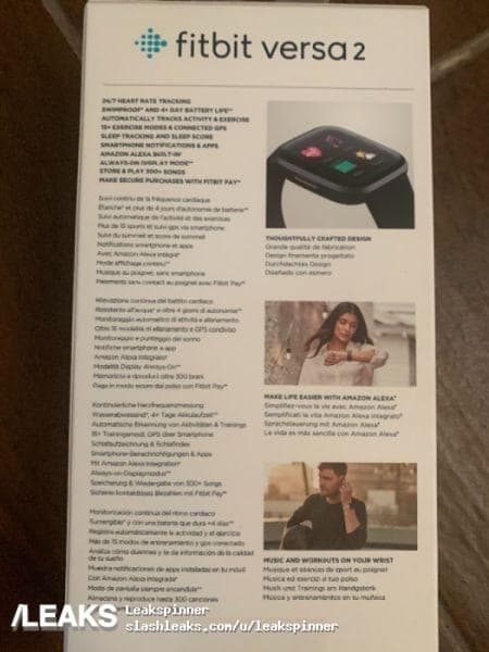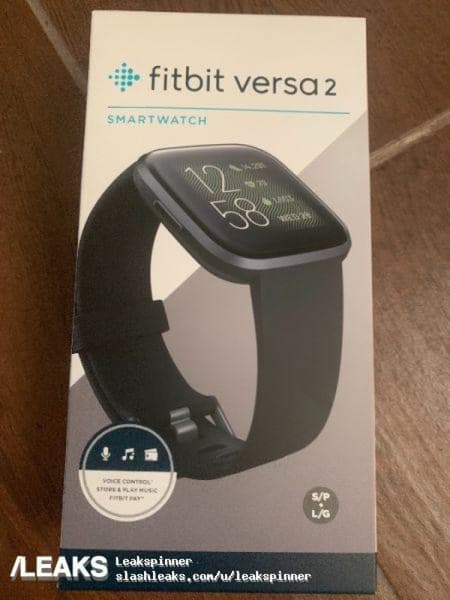 Еще до анонса появились фотографии, демонстрирующие коробку и процесс распаковки Fitbit Versa 2. На коробке указано наличие встроенного голосового помощника Amazon Alexa, возможность чтения сообщений и уведомлений со смартфона на экране умных часов, контроль качества сна, а также круглосуточной отслеживание частоты сердечных сокращений и время автономной работы, которое составляет около 4 дней.