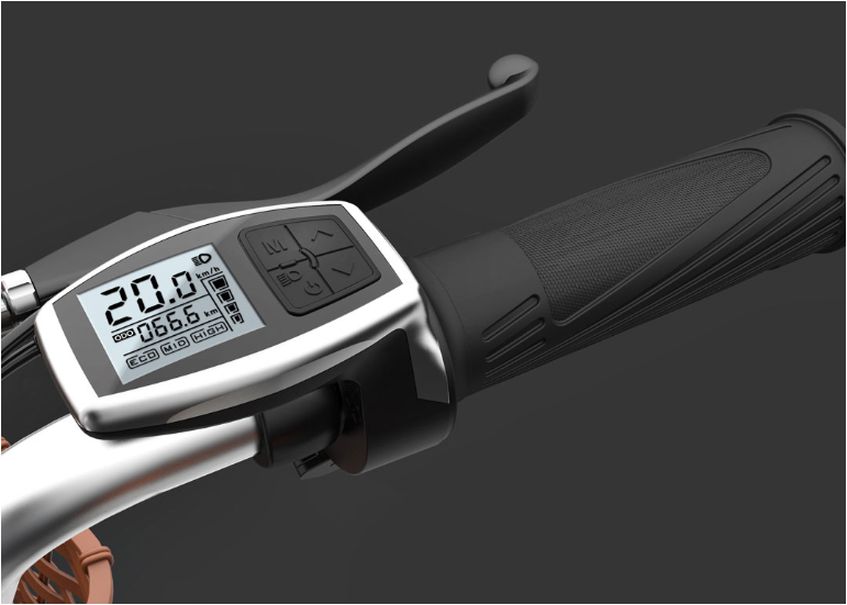 На правой рукоятке велосипеда расположен дисплей, который отображает такие параметры, как скорость, заряд аккумулятора и проч.