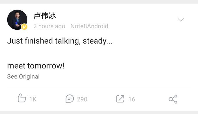 Глава бренда Redmi Лю Вейбинг на своей странице в Twitter пообещал завтра объявить «большие новости».