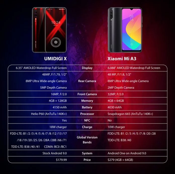 Емкость аккумулятора составляет 4150 мА•ч, есть поддержка быстрой 18-ваттной зарядки. Umidigi X оснащен модулем NFC. Ниже представлена таблица, демонстрирующая отличия Umidigi X от Xiaomi Mi A3.