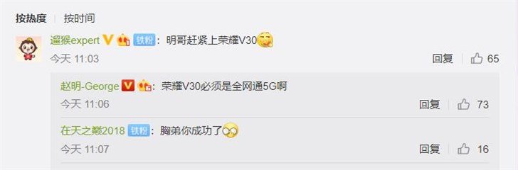 В социальной сети Weibo топ-менеджер сообщил, что Honor V30 будет поддерживать работу в сети 5G местного (китайского) оператора связи. Судя по всему, Honor V30 станет первой моделью бренда с поддержкой сетей 5G, ну а впоследствии модем 5G пропишется в Honor 30 или Honor 30 Pro.