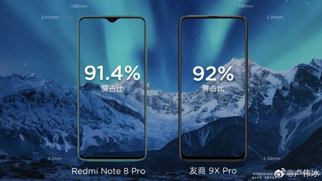 Теперь же Redmi снова сравнивает эти смартфоны между собой, оценивая их эффективной площади дисплеев и ширине рамок. Экран у Redmi Note 8 Pro занимает 91,4% площади лицевой панели, при этом его фронтальная камера расположена в каплевидном вырезе в центральной верхней части экрана.