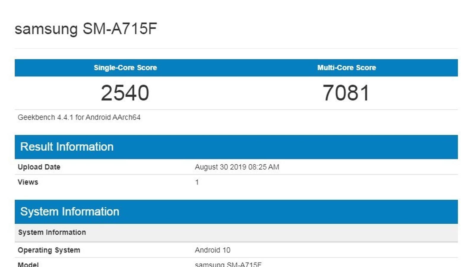 Оценки Geekbench для одноядерной и многоядерной производительности Galaxy A71 составили 2540 и 7081 баллов соответственно.