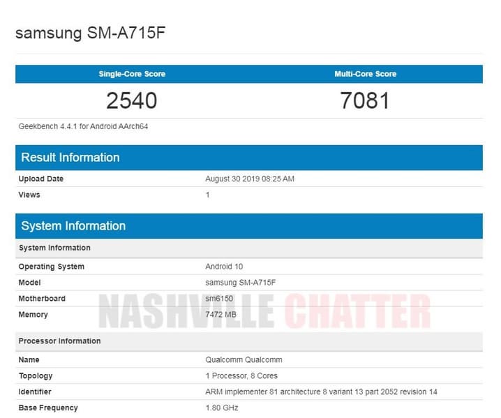 Смартфон Samsung Galaxy A71 с модельным номером SM-A715F был замечен в базе данных популярного бенчмарка Geekbench. Телефон оснащен 8 ГБ оперативной памяти и действительно работает под управлением новейшей ОС Android 10.